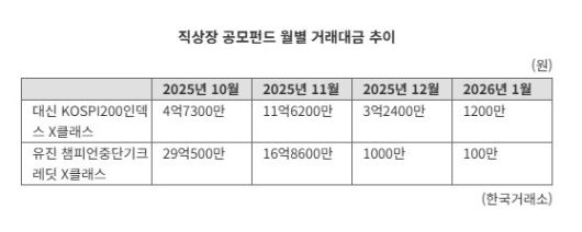 월별로 보면 거래는 상장 직후 증가세를 보이다 지난해 12월부터 얼어붙었다. '대신 KOSPI인덱스'의 지난해 11월 거래대금은 11억6200만원이었지만, 12월은 3억2400만원에 불과했다. '유진 챔피언중단기크레딧' 거래대금은 지난해 11월 16억8600만원에서 12월 1000만원으로 눈에 띄게 줄었다. 특히 이 상품은 이달 5일과 7일에도 거래량이 각각 '1주'에 불과했다.