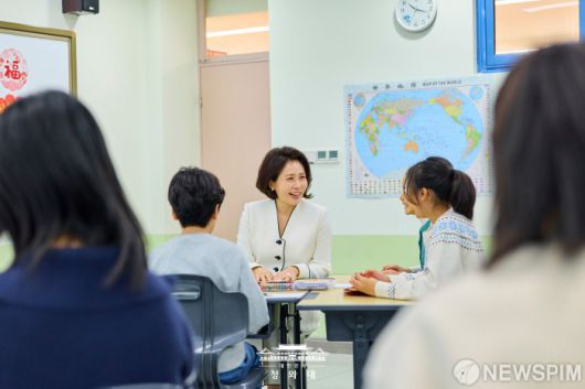 [서울=뉴스핌] 김혜경 여사가 지난 6일 중국 베이징에 위치한 북경한국국제학교를 찾아 학생들과 대화를 나누고 있다. [사진=청와대] 2026.01.07 photo@newspim.com