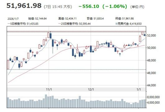 이날 닛케이225평균주가지수는 전일 종가보다 1.06%(556.10엔) 하락한 5만1961.98엔에 거래를 마쳤다. 도쿄증권거래소주가지수(TOPIX, 토픽스)도 0.77%(27.10포인트) 내린 3511.34포인트로 3영업일 만에 반락했다.