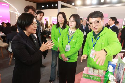 (서울=뉴스1) = 한성숙 중소벤처기업부 장관이 7일 중국 상하이에서 열린 ‘상하이 K-뷰티 글로우 위크’를 방문해 행사장을 둘러보고 있다. (중소벤처기업부 제공. 재판매 및 DB 금지) 2026.1.7/뉴스1