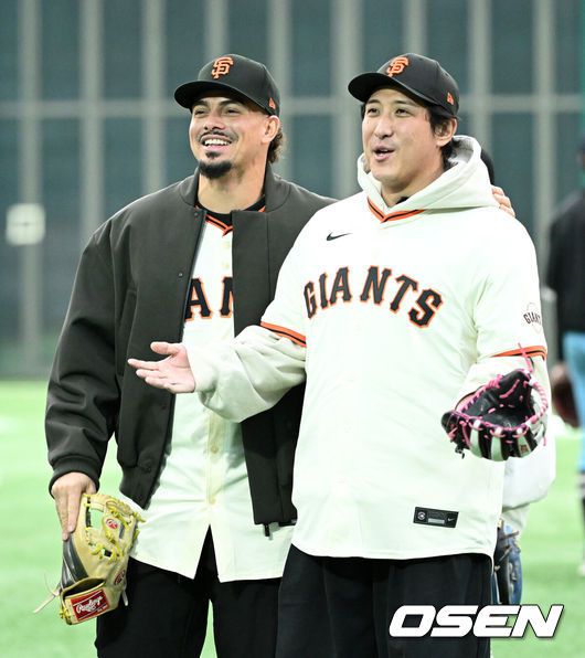 [OSEN=이천, 이대선 기자] 7일 오후 경기 이천 LG 챔피언스파크에서 샌프란시스코 자이언츠 미디어데이가 열렸다.샌프란시스코 구단은 이정후와 비텔로 감독, 윌리 아다메스가 참여하는 방한 프로그램을 진행 중이다. 이번 샌프란시스코의 한국 방문에는 래리 베어 CEO, 버스터 포지 사장, 잭 미나시안 단장 등 구단 주요 인사들이 함께한다.샌프란시스코 윌리 아다메스, 황재균이 야구 클리닉을 진행하고 있다. 2026.01.07 /sunday@osen.co.kr |