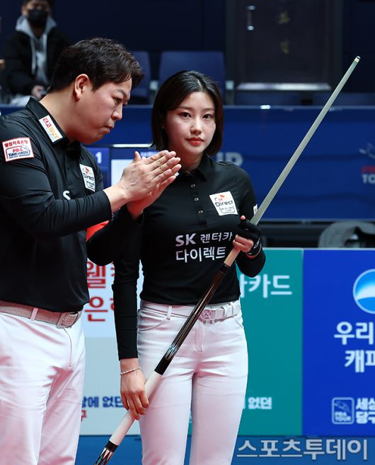 [고양(경기)=스포츠투데이 팽현준 기자] 7일 경기도 킨텍스 PBA스타디움에서 열린 웰컴저축은행 PBA 팀리그 2025-2026 5라운드 크라운해태와 SK렌터카의 경기, 여자복식에 출전한 SK렌터카 조예은이 주장 강동궁과 작전타임을 갖고 있다. 2026.01.07. [스포츠투데이 팽현준 기자 sports@stoo.com]
