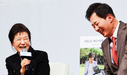 박근혜 전 대통령(왼쪽)이 지난 2024년 2월5일 오후 대구 수성구 인터불고호텔에서 열린 박근혜 회고록 출간기념 저자와의 대화에서 유영하 국민의힘 의원의 발언을 들으며 웃고 있다. 연합뉴스 |
