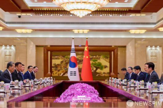 [서울=뉴스핌] 이재명 대통령이 지난 6일 중국 베이징 인민대회당에서 권력 서열 3위 자오러지 전국인민대표회의 상무위원장을 면담하고 있다. [사진=청와대] 2026.01.07 photo@newspim.com