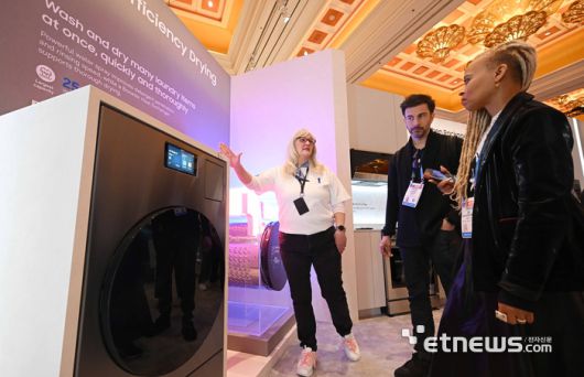 세계 최대 가전·정보기술(IT) 전시회 'CES 2026'이 개막한 6일(현지시간) 미국 네바다주 라스베이거스 윈 호텔에 마련된 삼성전자 단독 전시관에서 참관객이 세탁기와 건조기 등에 적용된 AI 기술을 살펴보고 있다. 라스베이거스=이동근기자 foto@etnews.com [Copyright © 전자신문. 무단전재-재배포금지]