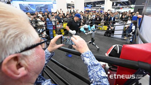 세계 최대 가전·정보기술(IT) 전시회 'CES 2026'이 개막한 6일(현지시간) 미국 네바다주 라스베이거스 컨벤션센터 노스홀에 마련된 유니트리 부스에서 인간과 로봇의 복싱 경기가 펼쳐지고 있다.