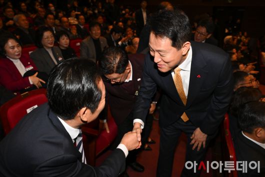 오세훈 서울시장(오른쪽)이 7일 서울 마포아트센터에서 열린 2026년 마포구 신년인사회에 참석해 정청래 더불어민주당 대표와 악수를 나누고 있다. /정재훈 기자