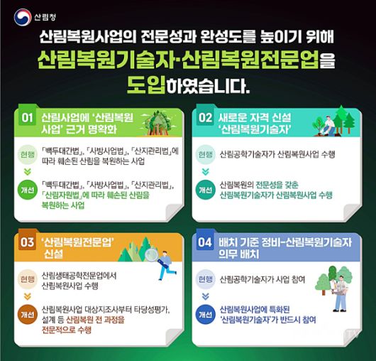 이와 함께 산림복원사업의 시행·설계·감리 현장에 배치하는 기술자를 기존 '산림공학기술자'에서 '산림복원기술자'로 변경해 사업 특성에 맞는 전문 기술인력이 현장에 투입되도록 개선했습니다.