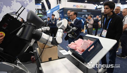 세계 최대 가전·정보기술(IT) 전시회 'CES 2026'이 개막한 6일(현지시간) 미국 네바다주 라스베이거스 컨벤션센터 노스홀에 마련된 휴머노이드 M.AX얼라이언스 부스에서 투모로우로보틱스의 휴머노이드 로봇이 물건 분류 시연을 하고 있다. 라스베이거스=이동근기자 foto@etnews.com [Copyright © 전자신문. 무단전재-재배포금지]