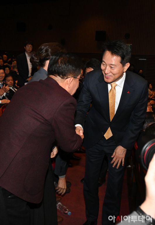 오세훈 서울시장(오른쪽)이 7일 서울 마포아트센터에서 열린 2026년 마포구 신년인사회에 참석해 박강수 마포구청장과 인사를 나누고 있다. /정재훈 기자