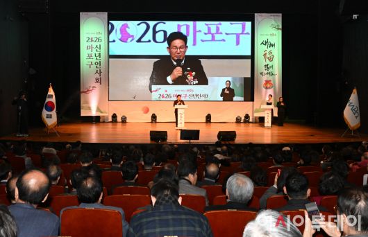 박강수 마포구청장이 7일 서울 마포아트센터에서 열린 2026년 마포구 신년인사회에서 신년사를 하고 있다. /정재훈 기자