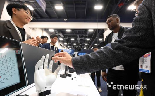 세계 최대 가전·정보기술(IT) 전시회 'CES 2026'이 개막한 6일(현지시간) 미국 네바다주 라스베이거스 컨벤션센터 노스홀에 마련된 휴머노이드 M.AX얼라이언스 부스에서 참관객이 에이딘로보틱스의 로봇 손을 살펴보고 있다. 라스베이거스=이동근기자 foto@etnews.com [Copyright © 전자신문. 무단전재-재배포금지]