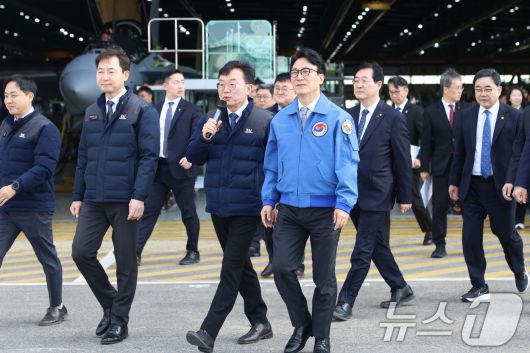 (서울=뉴스1) 임세영 기자 = 김민석 국무총리가 7일 경남 사천 한국항공우주산업(KAI)을 방문해, 생산이 완료된 KF-21 보라매 전투기의 내부 장비 등을 둘러보며 성능 및 운용에 대한 설명을 청취하고 있다. (총리실 제공. 재판매 및 DB 금지) 2026.1.7/뉴스1
