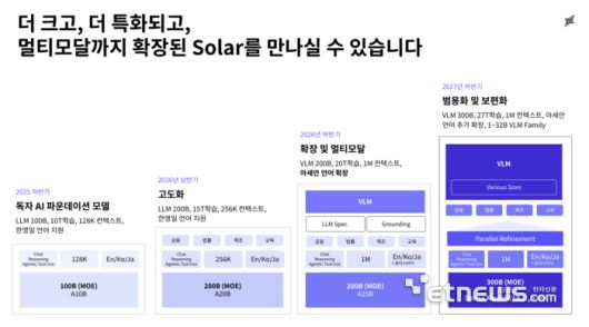 업스테이지는 '작지만 강한' AI 모델 개발을 지향한다. 이번 1차 평가를 앞두고 솔라 오픈 100B 모델을 공개한 데 이어 올해 하반기 중 200B 모델로 확대한다. 연내 거대언어모델(LLM) 중심에서 VLM으로 모델을 확장하고 2027년 중 300B을 달성하는 게 최종 목표다.