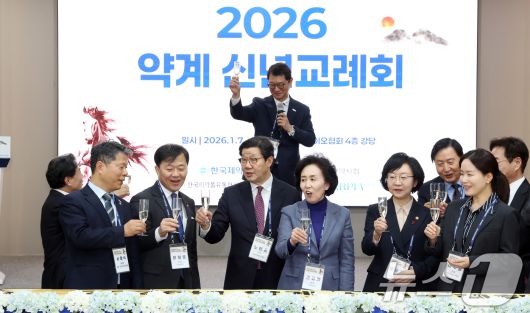 (서울=뉴스1) 김명섭 기자 = 7일 서울 서초구 한국제약바이오협회에서 열린 2026 약계 신년교례회에서 권영희 대한약사회장, 노연홍 한국제약바이오협회장, 오유경 식약처장 등 참석자들이 건배를 하고 있다. 2026.1.7/뉴스1msiron@news1.krCopyright ⓒ 뉴스1. All rights reserved. 무단 전재 및 재배포, AI학습 이용 금지.