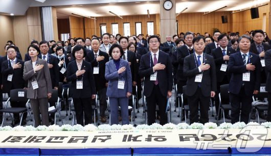(서울=뉴스1) 김명섭 기자 = 7일 서울 서초구 한국제약바이오협회에서 열린 2026 약계 신년교례회에서 권영희 대한약사회장, 노연홍 한국제약바이오협회장, 오유경 식약처장 등 참석자들이 국기에 대한 경례를 하고 있다. 2026.1.7/뉴스1