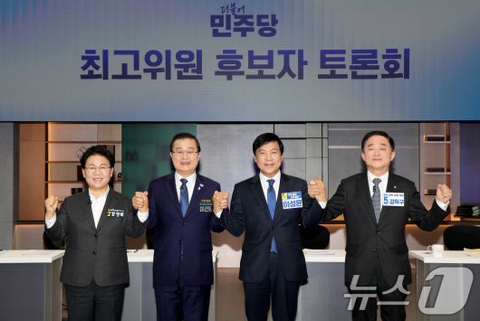 (서울=뉴스1) 국회사진기자단 = 더불어민주당 최고위원 보궐선거에 출마한 문정복(왼쪽부터), 이건태, 이성윤, 강득구 후보가 7일 서울 마포구 상암동 JTBC에서 열린 최고위원 보궐선거 제3차 합동토론회에 앞서 기념 촬영을 하고 있다. 2026.1.7/뉴스1