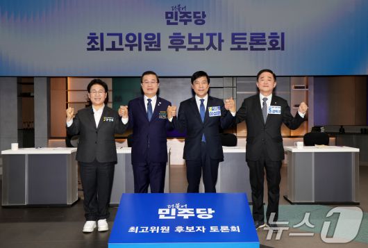 (서울=뉴스1) 국회사진기자단 = 더불어민주당 최고위원 보궐선거에 출마한 문정복(왼쪽부터), 이건태, 이성윤, 강득구 후보가 7일 서울 마포구 상암동 JTBC에서 열린 최고위원 보궐선거 제3차 합동토론회에 앞서 기념 촬영을 하고 있다. 2026.1.7/뉴스1