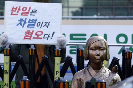 7일 낮 서울 종로구 중학동 옛 일본대사관 앞 평화의 소녀상 주위에서 극우단체 관계자가 ‘반일은 차별이자 혐오다’는 손피켓을 들고 서 있다. ⓒ News1 |