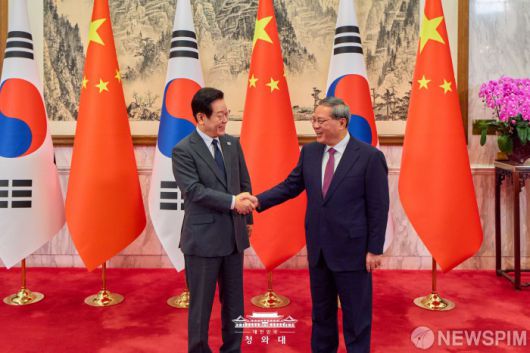 [서울=뉴스핌] 이재명 대통령이 지난 6일 오전 중국 베이징 댜오위타이(조어대·釣魚臺)에서 리창 총리를 만나 악수하고 있다. [사진=청와대] 2026.01.07 photo@newspim.com