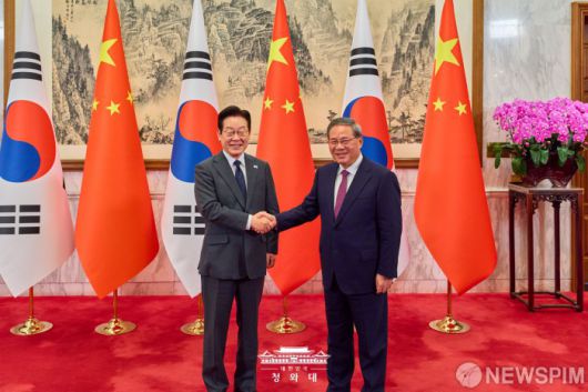 [서울=뉴스핌] 이재명 대통령이 지난 6일 오전 중국 베이징 댜오위타이(조어대·釣魚臺)에서 리창 총리를 만나 악수하고 있다. [사진=청와대] 2026.01.07 photo@newspim.com