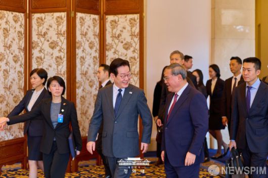 [서울=뉴스핌] 이재명 대통령이 지난 6일 오전 중국 베이징 댜오위타이(조어대·釣魚臺)에서 리창 총리와 이동하고 있다. [사진=청와대] 2026.01.07 photo@newspim.com