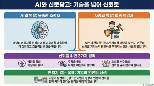 광고는 기업도 살리고 언론도 살려야 한다. 이 단순한 원칙은 기술이 바뀌어도 달라지지 않는다. AI는 광고를 새롭게 만들고 있지만, 신문광고가 지켜야 할 중심은 여전히 같다. 신뢰를 해치지 않으면서 기업의 발전을 돕는 것, 그것이 AI 시대에도 신문광고가 맡아야 할 역할이다.