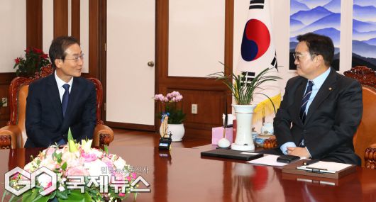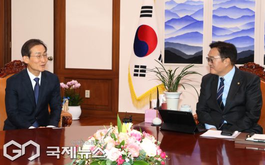 [이용우 기자] (서울=국제뉴스) 김호철 감사원장이 7일 서울 여의도 국회에서 우원식 의장을 예방, 대화하고 있다./사진=이용우 기자<저작권자 Copyright ⓒ 국제뉴스 무단전재 및 재배포 금지>