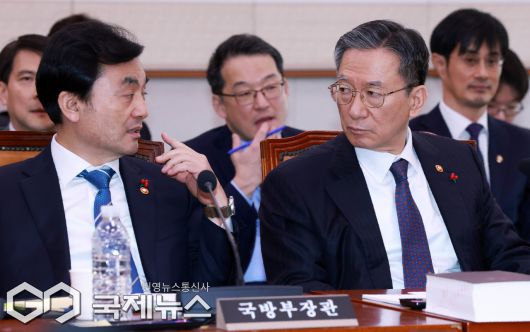 (서울=국제뉴스) 안규백 국방부 장관과 정성호 법무부 장관이 7일 오후 서울 여의도 국회에서 열린 법제사법위원회 전체회의에서 대화를 나누고 있다./사진=이용우 기자