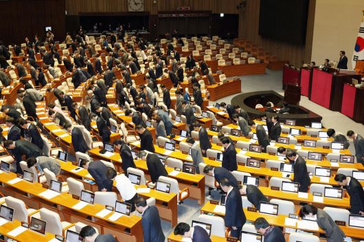 30일 서울 여의도 국회에서 열린 제430회국회(임시회) 3차 본회의에서 의원들이 산회가 선포된 후 인사하고 있다. |