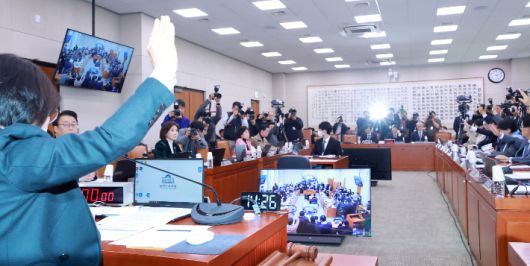 국회 법제사법위원회 위원장인 더불어민주당 추미애 의원을 비롯한 여당 법사위원들이 7일 국회 법사위 전체회의에서 2차 종합특검법안 등 안건 상정에 대해 거수로 찬성에 투표하고 있다. 연합뉴스 |