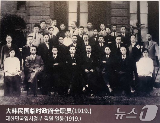 (상하이(중국)=뉴스1) 허경 기자 = 이재명 대통령과 김혜경 여사가 7일 오후 상하이 임시정부청사 기념관을 방문한 가운데 1919년 당시 대한민국 임시정부 직원 단체사진이 걸려 있다. 2026.1.7/뉴스12expulsion@news1.krCopyright ⓒ 뉴스1. All rights reserved. 무단 전재 및 재배포, AI학습 이용 금지.