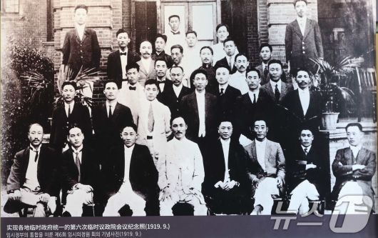 (상하이(중국)=뉴스1) 허경 기자 = 이재명 대통령과 김혜경 여사가 7일 오후 상하이 임시정부청사 기념관을 방문한 가운데 1919년 당시 대한민국 임시정부 직원 단체사진이 걸려 있다. 2026.1.7/뉴스12expulsion@news1.krCopyright ⓒ 뉴스1. All rights reserved. 무단 전재 및 재배포, AI학습 이용 금지.
