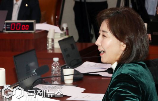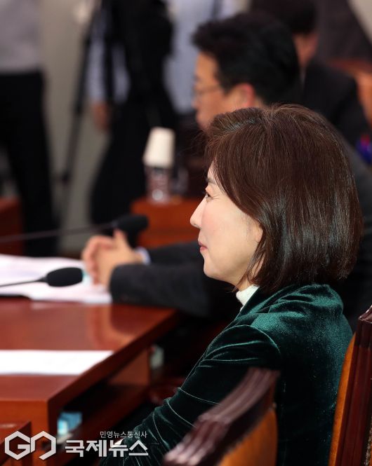 (서울=국제뉴스) 나경원 국민의힘 의원이 7일 오후 서울 여의도 국회에서 열린 법제사법위원회 전체회의에서 자신에 대한 최혁진 의원의 비판 발언을 듣고 미소를 보이고 있다./사진=이용우 기자