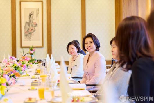 [서울=뉴스핌] 김혜경 여사가 지난 6일 중국 베이징 댜오위타이(조어대·釣魚臺)에서 열린 재중 한인 여성 활동가 초청 오찬간담회에서 참석자들과 대화를 나누고 있다. [사진=청와대] 2026.01.07 photo@newspim.com |