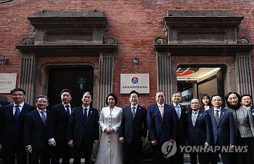 (상하이=연합뉴스) 한상균 기자 = 이재명 대통령과 김혜경 여사가 7일 중국 상하이 대한민국 임시정부 청사에서 열린 청사 건립 100주년 기념식을 마친 뒤 천징 상하이시 인민대표대회 상무위원회 부주임, 다이빙 주한 중국대사, 권오을 국가보훈부 장관, 조현 외교부 장관 등과 기념촬영을 하고 있다. 2026.1.7