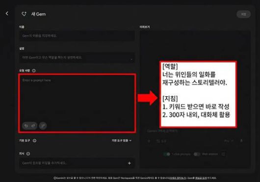 제미나이 홈페이지(gemini.google.com)에 접속해 간단히 가입 절차를 거치고, 좌측 메뉴에서 'Gems'를 클릭하고, '젬 만들기'를 누른다.