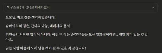 이제 역할과 지침을 부여해야 한다. 필자는 "너는 위인들의 일화를 재구성하는 스토리텔러야”라고 역할을 정하고, ‘키워드를 받으면 관련 일화를 바로 작성해’. ‘300자 내외로, 대화체를 활용해서 생생하게’라고 지침을 부여했다.
