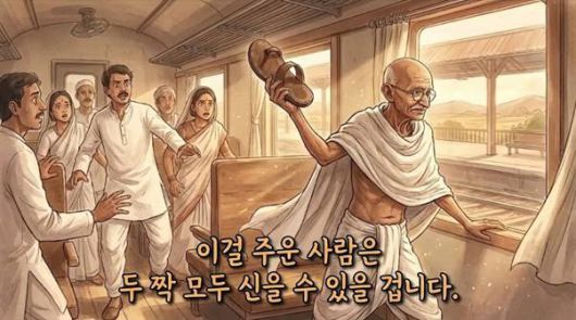 혼잡한 기차에 간신히 뛰어오른 간디. 하지만 낡은 신발 한 짝이 그만 플랫폼으로 떨어져버렸다. 그 순간, 간디는 망설임 없이 나머지 한 짝도 창밖으로 던졌다.