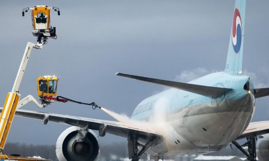 5일 네덜란드 암스테르담 스키폴 공항에서 대한항공 항공기 제빙 작업이 진행중이다. 암스테르담/EPA연합뉴스 |