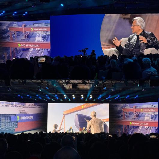 황 CEO는 HD현대의 디지털 트윈 기술에 대해 “우리가 협력하고 있는 모습을 아주 잘 보여준 사례이며, 디지털 트윈이라는 아이디어를 실현하고 있는, 엔지니어링의 모든 측면을 설계하고, 단순히 CAD만이 아니라 컴퓨팅, 전자시스템까지 전부 통합해서 하나의 디지털 트윈 안에 구현하는 것”이라고 말했다.