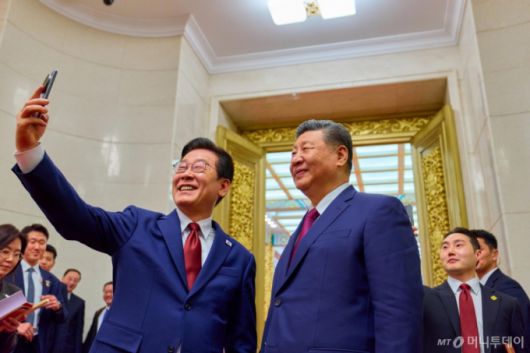 [베이징=뉴시스] 최동준 기자 = 중국을 국빈 방문 중인 이재명 대통령이 5일(현지 시간) 베이징 인민대회당에서 열린 공식만찬을 마친 뒤 경주 정상회담에서 시진핑 국가주석에게 선물 받은 샤오미폰으로 시 주석과 셀카를 찍고 있다. (공동취재) 2026.01.05. photocdj@newsis.com /사진=최동준 |