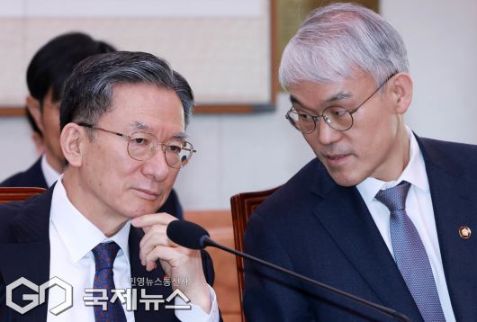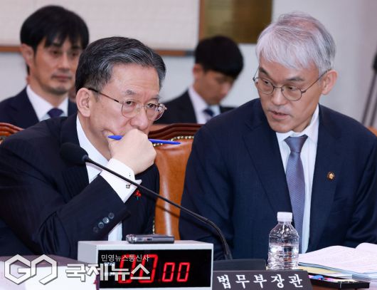 (서울=국제뉴스) 정성호 법무부 장관과 천대엽 법원행정처장이 7일 오후 서울 여의도 국회에서 열린 법제사법위원회 전체회의에서 대화를 나누고 있다./사진=이용우 기자