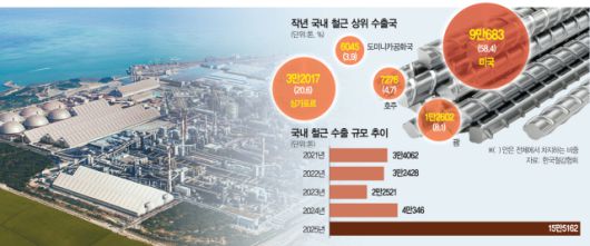특이한 점은 미국으로의 수출이 급격히 늘어났다는 것이다. 지난해 국내 철강사들의 철근 수출국 가운데 미국은 9만 683톤으로 물량 기준 1위를 차지했다. 철근의 미국 수출은 직전 해(3698톤)와 비교하면 무려 2349.5% 넘게 늘어났다. 전체 수출 물량에서 미국이 차지하는 비중(58.4%) 역시 절반을 넘겼다. 미국 다음으로 싱가포르(3만 2017톤), 괌(1만 2602톤), 호주(7276톤), 도미니카공화국(6045톤) 등이 수출 상위국 명단에 올랐다.
