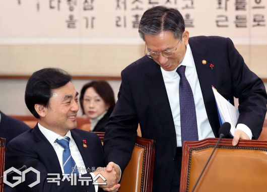 (서울=국제뉴스) 정성호 법무부 장관이 7일 오후 서울 여의도 국회 법제사법위원회 전체회의에서 안규백 국방부 장관과 악수하고 있다./사진=이용우 기자
