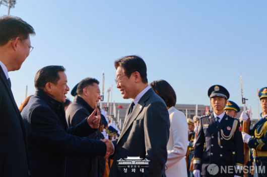[서울=뉴스핌] 시진핑 중국 국가 주석과 정상회담을 마친 이재명 대통령이 지난 6일 오후 김혜경 여사와 함께 베이징 서우두공항에서 상하이로 출발하며 관계자들과 인사를 나누고 있다. [사진=청와대] 2026.01.07 photo@newspim.com