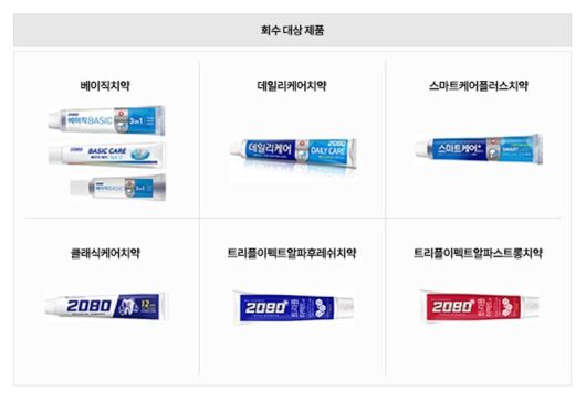 이번 회수 대상 제품은 ▲2080 베이직 치약 ▲2080 데일리케어 치약 ▲2080 스마트케어플러스 치약 ▲2080 클래식케어 치약 ▲2080 트리플이펙트 알파후레쉬 치약 ▲2080 트리플이펙트 알파스트롱 치약 6종이다.