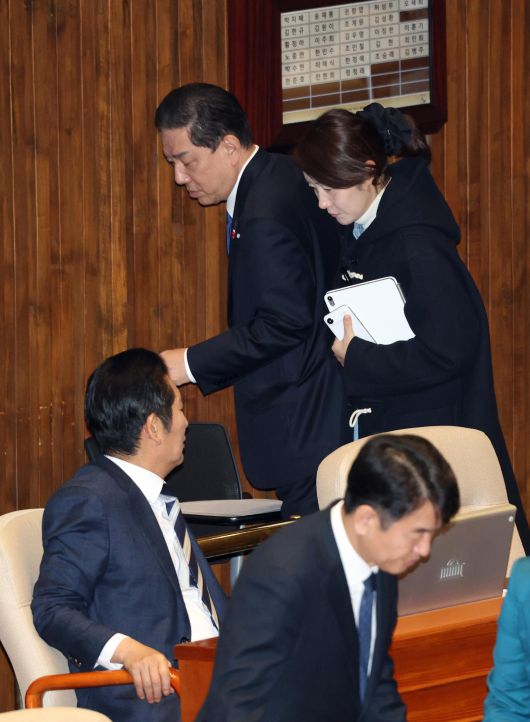 서울 여의도 국회에서 열린 제430회국회(임시회) 제2차 본회의에서 김병기 전 더불어민주당 원내대표와 강선우 의원이 대화를 나누며 발걸음을 옮기고 있다. 왼쪽 아래는 정청래 대표. 2025.12.31/뉴스1 |