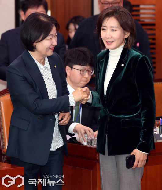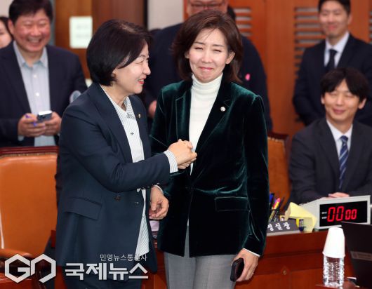 (서울=국제뉴스) 7일 서울 여의도 국회에서 열린 제430회국회(임시회) 법제사법위원회 제3차 전체회의에서 추미애 위원장이 나경원 국민의힘 의원과 새해 인사를 나누고 있./사진=이용우 기자