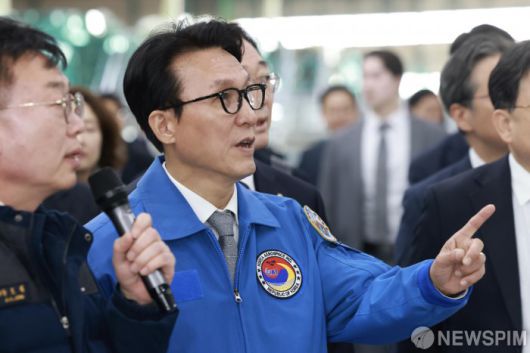 [서울=뉴스핌]김민석 국무총리는 7일 경남 사천 한국항공우주산업(KAI)을 방문해, 생산이 완료된 KF-21 보라매 전투기의 내부 장비 등을 둘러보며 성능 및 운용에 대한 설명을 청취하고 있다. [사진=총리실] 2026.01.07 photo@newspim.com